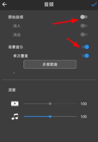 點(diǎn)擊關(guān)閉原始音頻,打開“背景音樂”功能,從手機(jī)中選取音頻文件進(jìn)行添加。