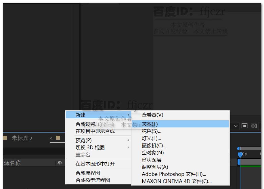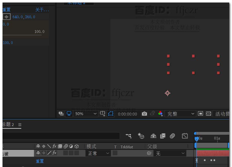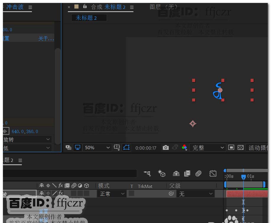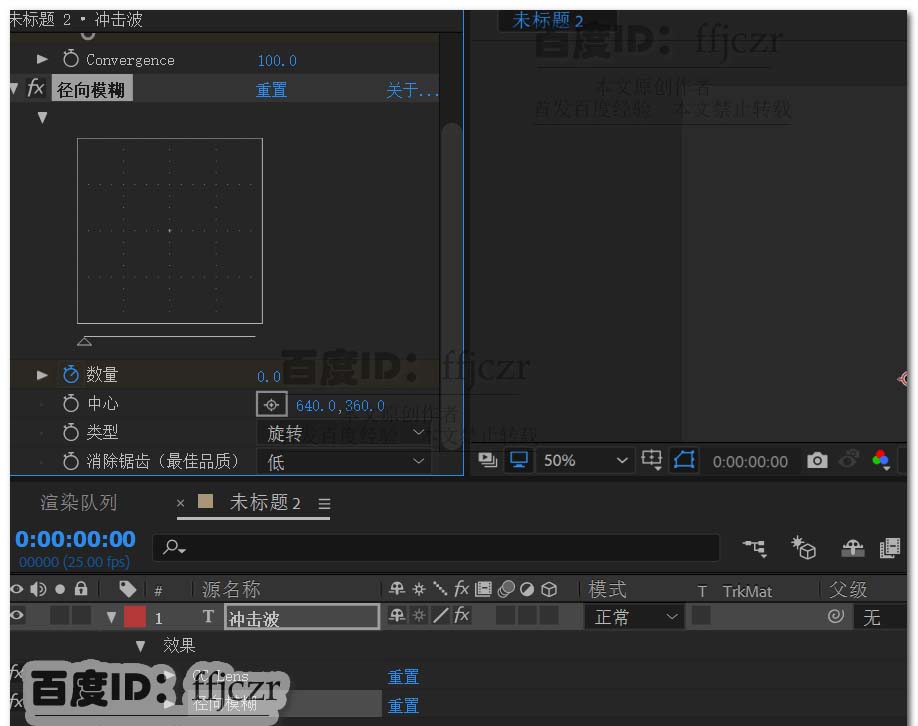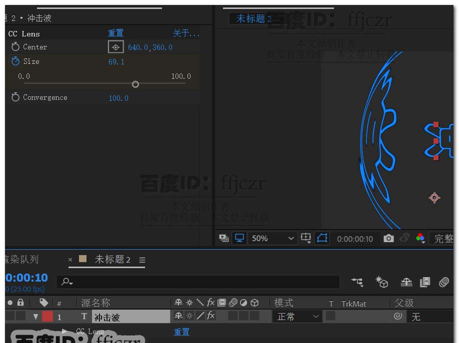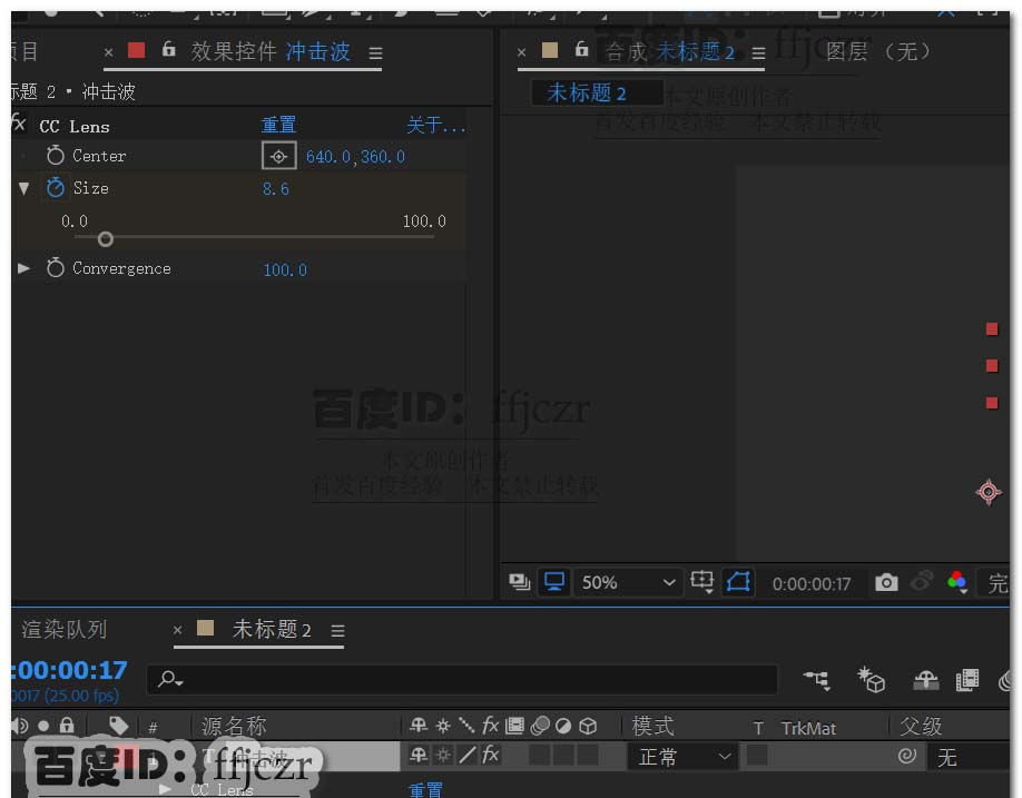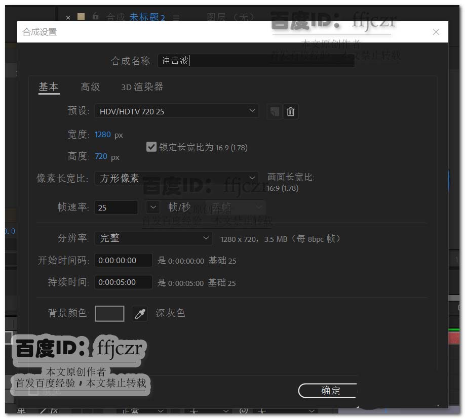 1、新建一個合成文件,命名為沖擊波;1280*720,方形像素,幀速率為25,持續時間為5秒。