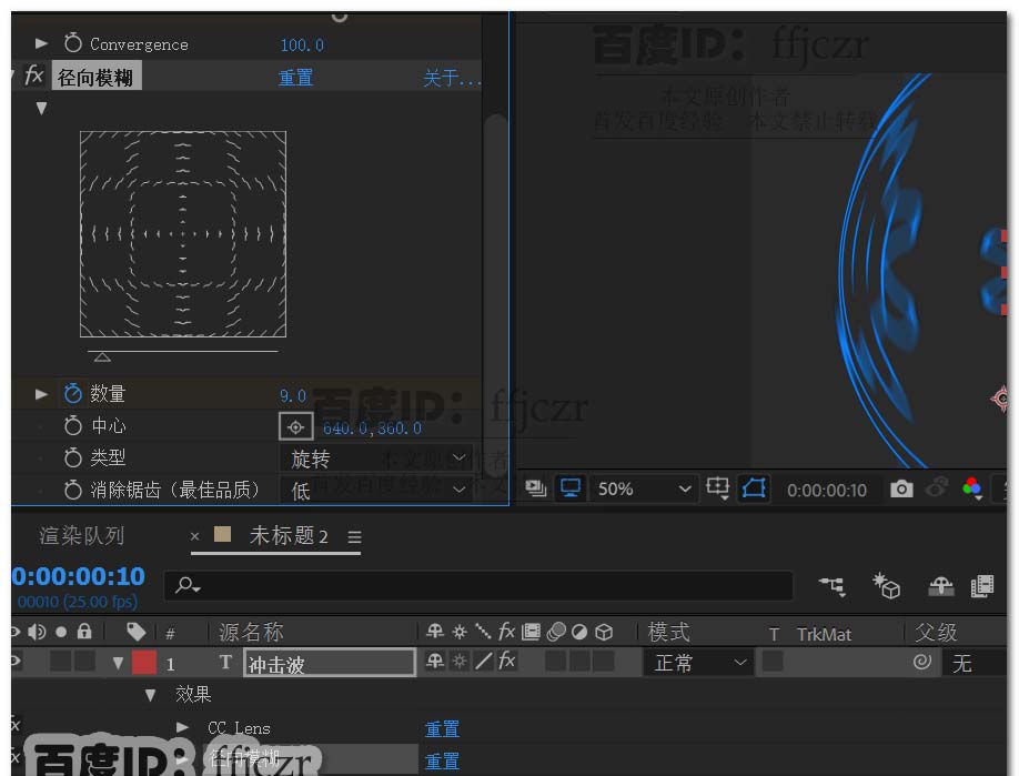 6、根據CC Lens效果中的關鍵幀位置,在徑向模糊的數量上激活關鍵幀。通過調整數量的值來達到模糊的效果。最終得到動圖所示的效果。