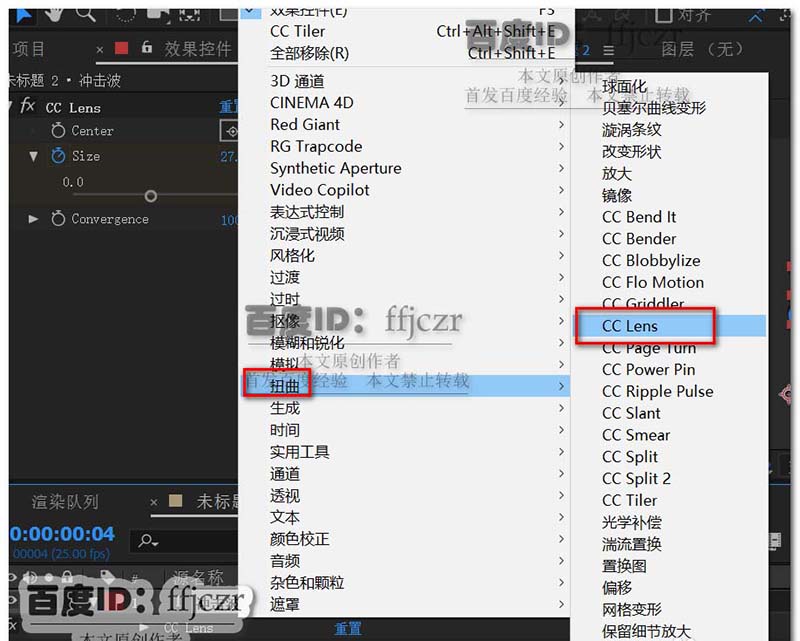 4、在時間線為0時,激活CC Lens效果中的Size關鍵幀,在1秒的時間內,分三次調整該關鍵幀的數值。使文字得到如動圖所示的效果。