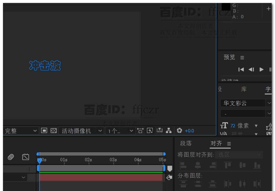 2、在合成層中添加文字層,輸入文字“沖擊波”,字體選用華文彩云,藍色字。并將文字居中于顯示區。