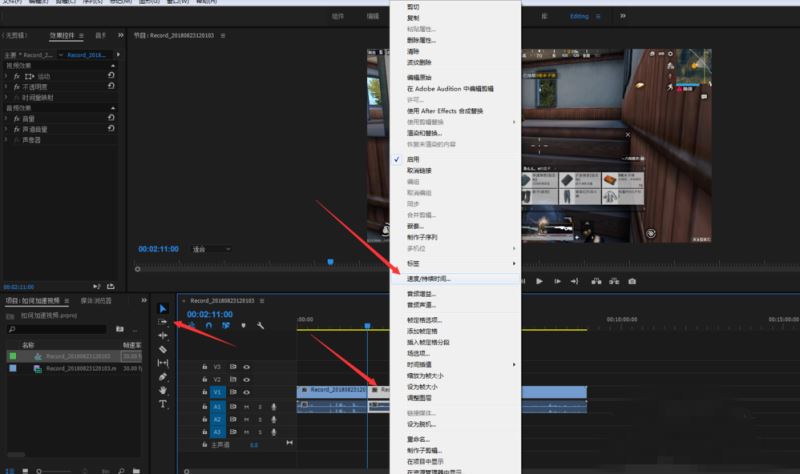 點擊選擇工具(箭頭指示的那個),選中你要加速的視頻片段,右擊鼠標,選擇速度持續(xù)時間,如圖,