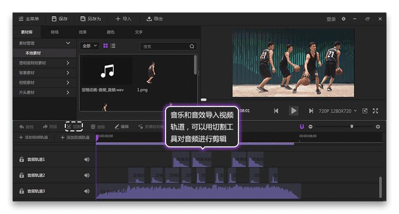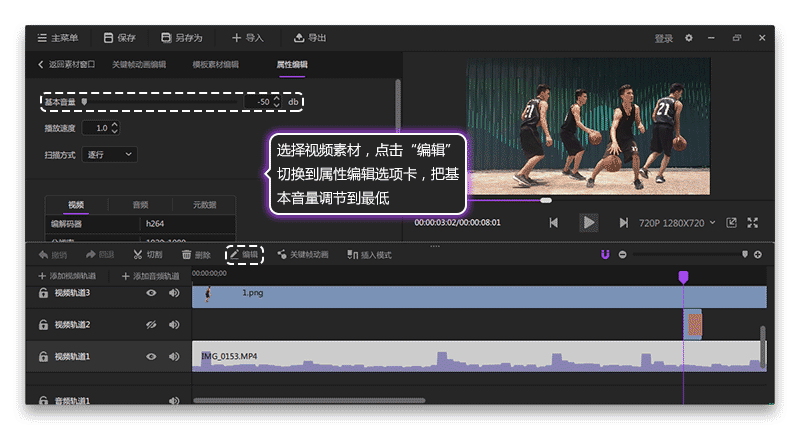 8.接下來(lái)就是關(guān)于視頻的音效和音樂(lè)了。如圖9所示,選擇視頻軌道的視頻,點(diǎn)擊“編輯”,切換到屬性選項(xiàng)卡,把視頻的基本音量值調(diào)節(jié)到最低。如圖10所示,導(dǎo)入合適的背景音樂(lè)和音效到本地素材窗口,然后再把音頻導(dǎo)入到音頻軌道就可以了,可以用切割工具對(duì)音頻進(jìn)行剪輯。