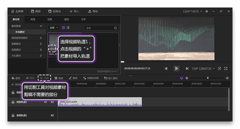 2.打開(kāi)神剪輯軟件,新建項(xiàng)目,導(dǎo)入拍攝的視頻到軟件的本地素材窗口,如圖1。之后的素材導(dǎo)入軟件操作也是一樣的。然后選擇視頻軌道1,點(diǎn)擊素材的“+”,添加視頻到視頻軌道1,如圖2,之后的素材導(dǎo)入軌道的操作也是一樣的。