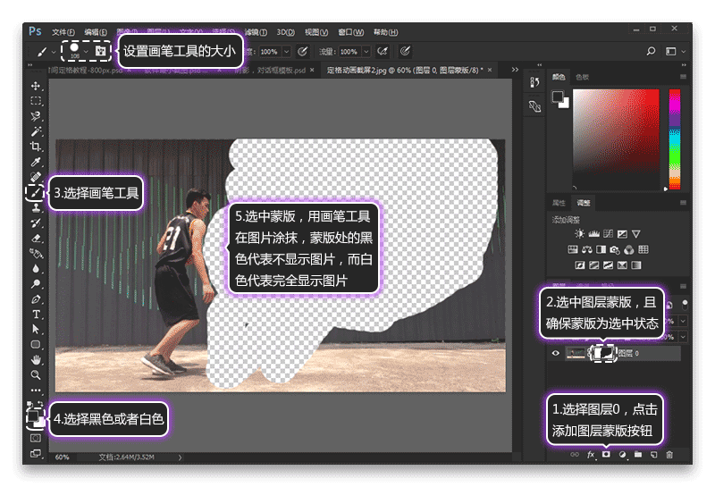 摳圖操作步驟如圖5所示,打開(kāi)ps軟件,“文件-打開(kāi)”,選擇剛剛的截圖文件,在ps中打開(kāi)截圖。第一步選擇圖片圖層,點(diǎn)擊添加圖層蒙版按鈕,第二步選擇圖層的蒙版,且保證蒙版為被選中的狀態(tài),第三選擇畫(huà)筆工具,設(shè)置合適大小,第四步設(shè)置前景色,設(shè)置為白色或者黑色,第五步是用畫(huà)筆工具對(duì)圖片進(jìn)行涂抹,蒙版處的黑色代表不顯示圖片,白色代表完全顯示圖片。