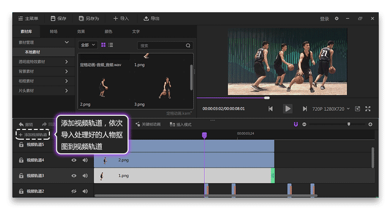6.把摳圖后的背景透明圖片導(dǎo)入該項(xiàng)目,添加視頻軌道,并把處理好的截圖導(dǎo)入視頻軌道,如圖7所示。