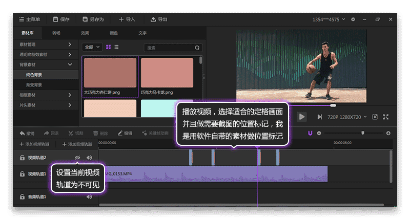 3.播放視頻,查看并選擇適合定格的畫(huà)面,并且標(biāo)記好需要定格位置,我是通過(guò)放置素材在視頻軌道2的來(lái)標(biāo)記截圖位置的,所以視頻軌道2需要設(shè)置為不可見(jiàn),如圖3所示。