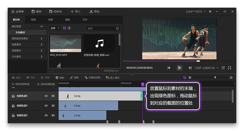 7.改變?nèi)宋飺笀D圖片的時(shí)長(zhǎng)。如圖8所示,放置鼠標(biāo)到素材的末端,出現(xiàn)綠色圖標(biāo),拖動(dòng)鼠標(biāo)到對(duì)應(yīng)的截圖的位置處,其實(shí)就是該圖片的時(shí)長(zhǎng)為對(duì)應(yīng)的截圖位置處。