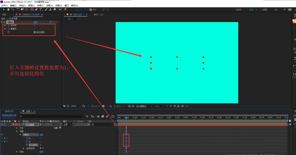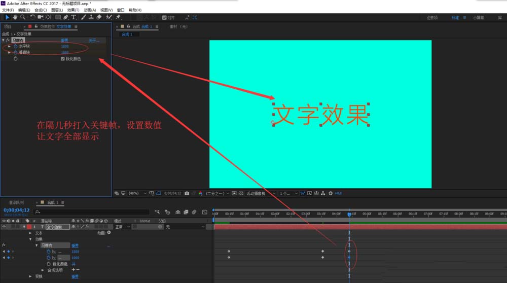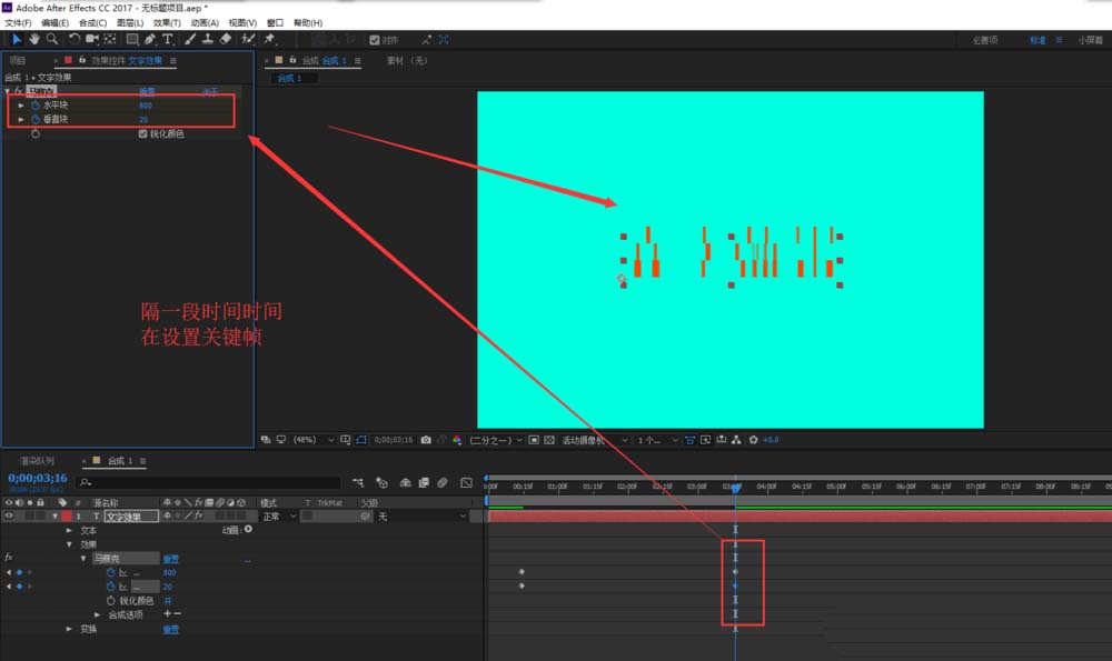 6、在時間軸窗口中將時間軸再往后移動多個幀,在設置馬賽克的水平塊與垂直塊的數值都為1000.這個時候文字會完全顯示。將時間軸移到最開始位置,按鍵盤空格鍵播放視頻,一個馬賽克閃爍顯示文字的動畫效果就出現了。