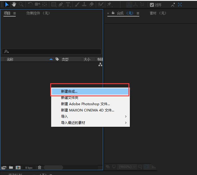 1、在新建的AE項目中,找到項目窗口,在項目窗口中右鍵鼠標選擇新建合成命令,在合成設置窗口中設置合成的大小等,然后單擊合成背景,給這個合成選擇一個舒服的背景顏色。