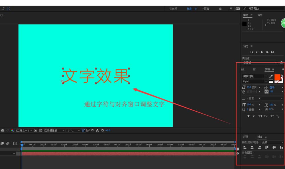 3、在合成圖層窗口中,單擊選中這個文本內容圖層,分別打開并找到字符與對齊窗口,在字符窗口中設置文字的字號,字體,字體顏色等;在對齊窗口中設置文字與合成畫布對齊使其處于正中間位置。