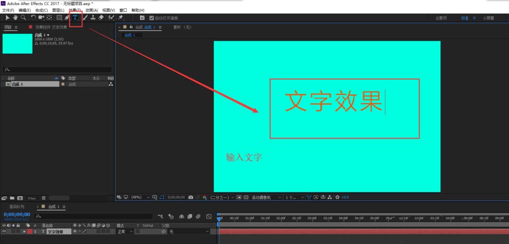 2、找到AE上方的工具欄選項,在AE工具欄中選中文本工具,然后用文本工具在合成預覽窗口處單擊鼠標左鍵,在閃動的光標位置輸入文本內容“AE效果”。