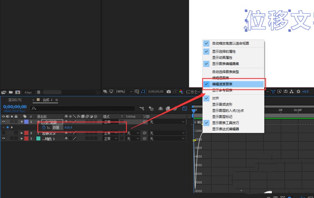 6、將時間軸移到到最開始的地方,將線段連接改為圓角連接,并拖動數量的數值,一直到文字效果將背景顏色全部遮??;收起形狀圖層,按快捷鍵U只顯示數量,打開圖標編輯器,在圖標編輯器中右鍵選擇編輯速度圖表,然后調整曲線即可。調整完成后就可以播放預覽動畫效果了。