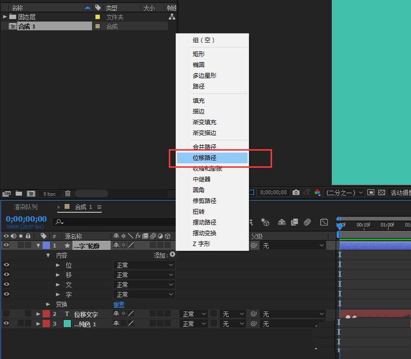 5、展開形狀圖層,點開內容,單擊效果,在效果中找到“位移路徑”,單擊添加一個位移路徑效果;然后將時間軸往后移幾秒,在位移路徑的數量上打入一個關鍵幀,并設置數值為1.