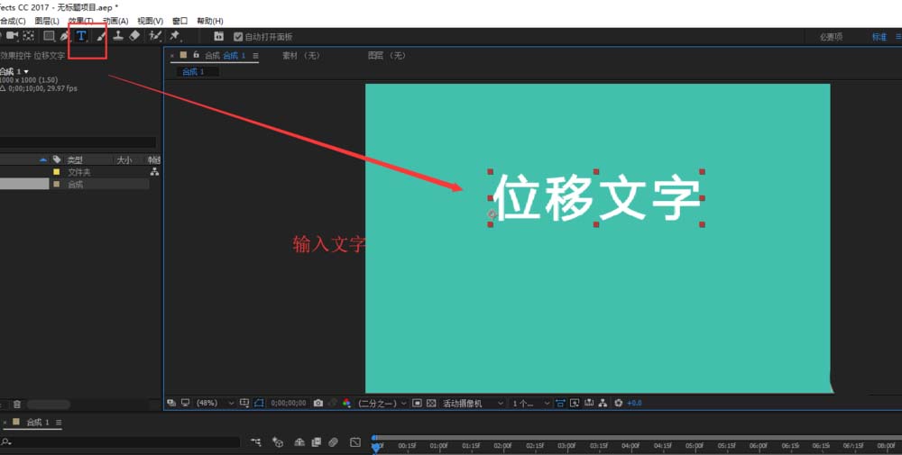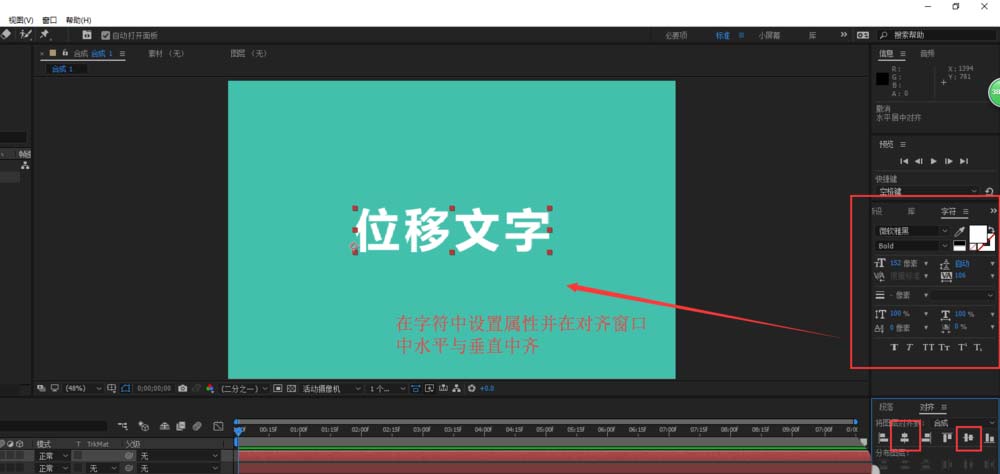 3、在AE的工具選項中選擇文本工具,然后用文本工具在合成畫布中輸入文本“位移文字”,打開字符窗口,在字符窗口中設置好文本的屬性,在打開對齊窗口,在對齊窗口中單擊水平中齊與垂直中齊。