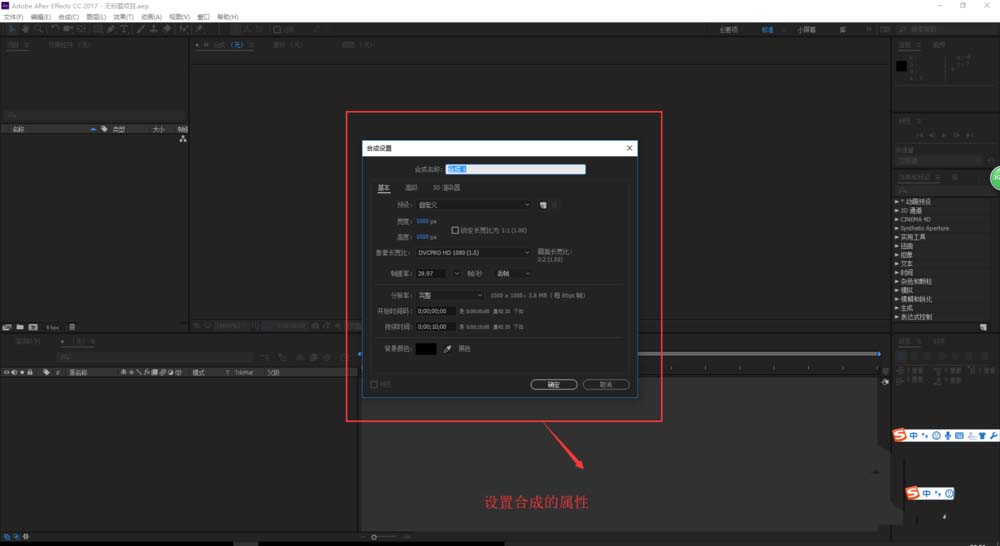 1、在打開并新建的AE項目中找到菜單欄中的合成菜單,在合成菜單欄中執行新建合成命令,然后新建一個合成,并設置好合成的屬性。