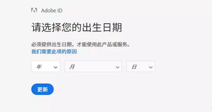 4、就是有的時(shí)候會(huì)彈出這個(gè)框的,這個(gè)你就隨便填寫一個(gè)日期就可以了,然后更新一下。可能是新版本使用,Adobe公司在做一個(gè)用戶年齡調(diào)查,這是無關(guān)緊要的。