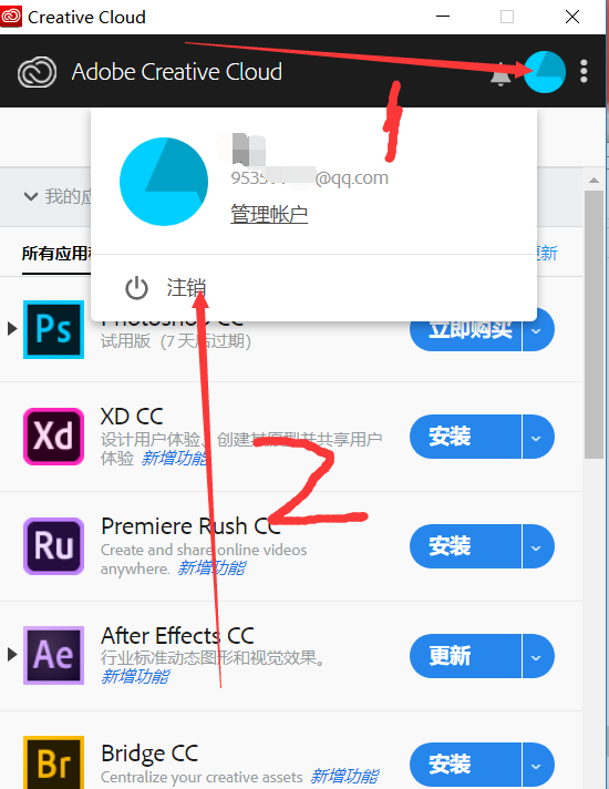 3、非常關(guān)鍵,在我們完成替換之后,就可以關(guān)閉所有界面了,這個(gè)時(shí)候也不要打開軟件去查看還有沒有試用期7天的顯示了。關(guān)鍵點(diǎn):接著我們?cè)偃ゴ蜷_Adobe Creative Cloud云工具,把AdobeID賬號(hào)注銷掉就可以了,如下圖,打開之后注銷掉。
