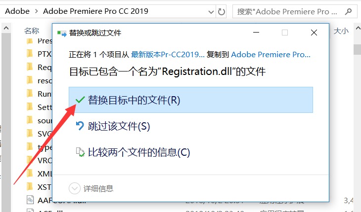 2、然后打開軟件的根目錄就把之前復(fù)制的注冊(cè)補(bǔ)丁,粘貼進(jìn)去。記住是粘貼進(jìn)去,不是直接拉進(jìn)去。粘貼進(jìn)去之后,會(huì)彈出替換,點(diǎn)擊替換就可以了。根目錄的意思就是:你軟件安裝到什么位置了,下面是我軟件安裝的Pr2019根目錄。你不要告訴我下,你軟件都安裝好了,都開始破解了,連軟件安裝到那個(gè)盤都不知道。