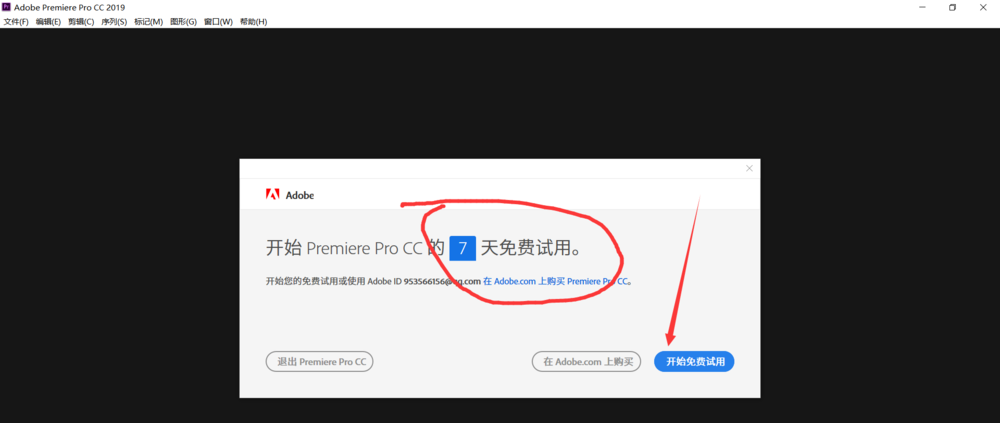 5、更新完之后,會(huì)跳出PrCC2019的免費(fèi)試用7天,如果你沒有購買版權(quán)的,就點(diǎn)擊開始免費(fèi)試用