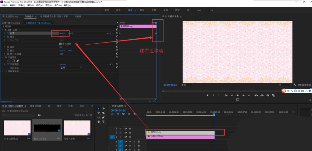 5、接上一步將時間軸移到到最后面的位置,然后在位置設置上在打入一個關鍵幀,將花紋素材在水平方向上往右移動,一直到最右端,這樣就形成了一個畫完從左向右運動的動畫效果了。