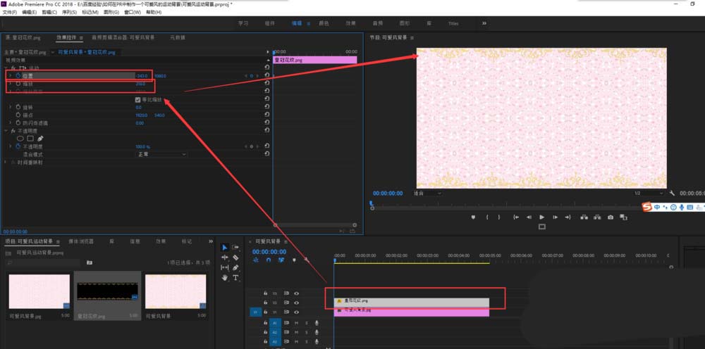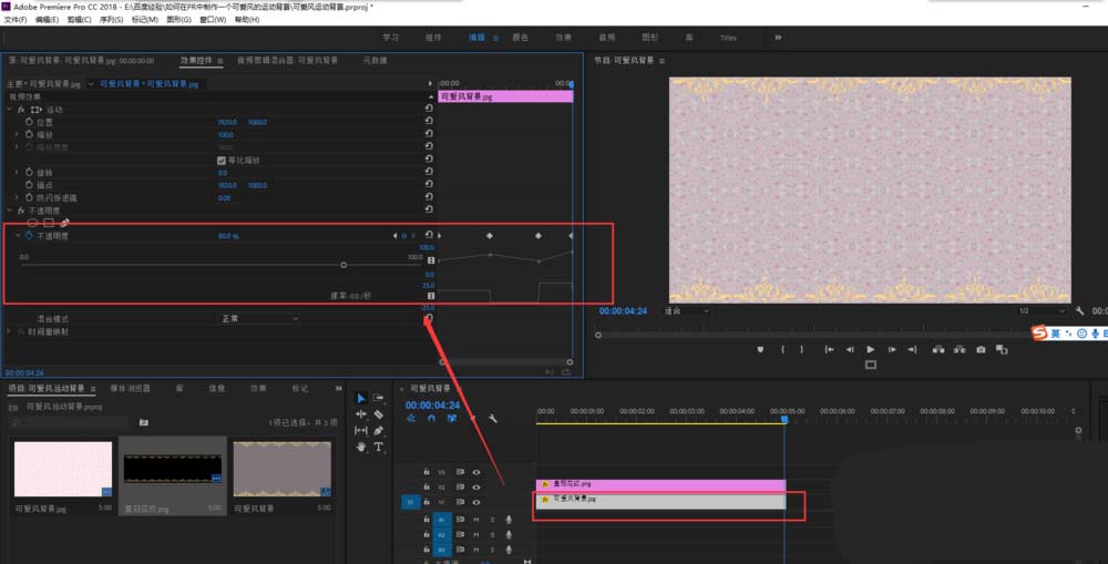 6、在選中可愛風背景素材,當前的背景素材顏色有點蓋住花紋,所以打開效果控件,在不透明度選項中設置背景圖片素材的不透明度。