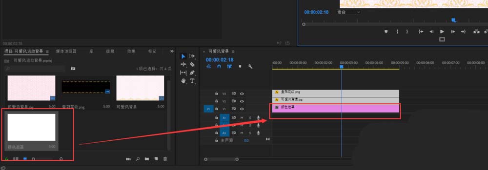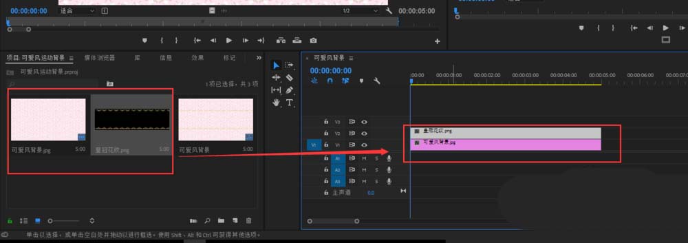 3、分別選中可愛風背景素材與花紋素材,將其分別拖入到時間軸窗口的視頻軌道1上面和視頻軌道2上。