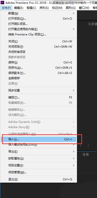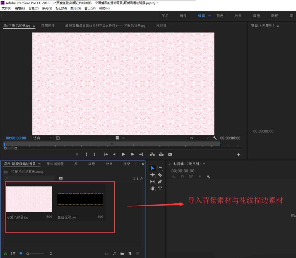 2、在PR文件菜單中,執行導入命令,然后在導入的窗口中將一個可愛風背景與一個花紋描邊的素材選中導入到PR軟件的項目管理窗口中。