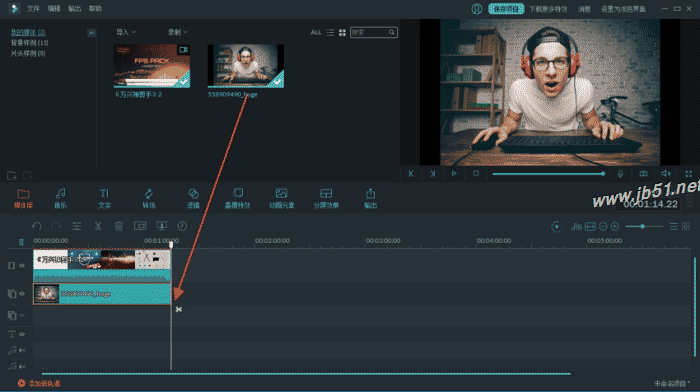 2、我們將已導入資源庫的照片用鼠標左鍵單擊進行拖曳到時間軸中。