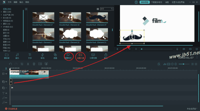 在預覽窗口點擊疊覆特效或動畫元素,找到適合遮蓋的圖案,這里選擇的是一個大胡子動畫,其中還有不同類型的動畫可以用來遮蓋,添加到需要遮蓋的地方上。特效遮蓋就完成啦。