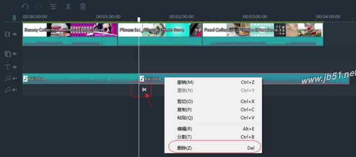 2、 根據音樂節奏再看是否需要調整素材時長,尤其是高潮部分,畫面和音樂共鳴,混剪效果才更出眾。在要刪除的視頻首尾部位各點擊剪刀按鈕,然后右鍵刪除即可。