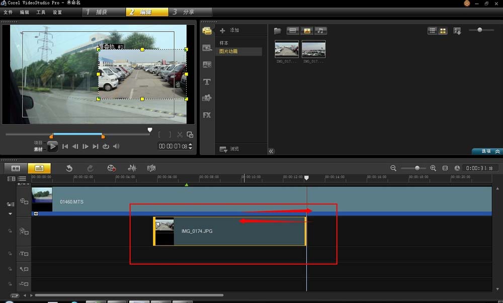 6、選中“覆疊軌”上的素材之后,我們還可以很方便的用鼠標拖動素材,改變其時間長度。
