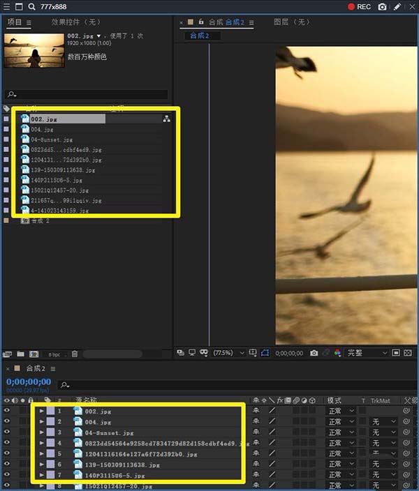 4、把項目面板中需要使用的素材,拖動到下方的合成序列中