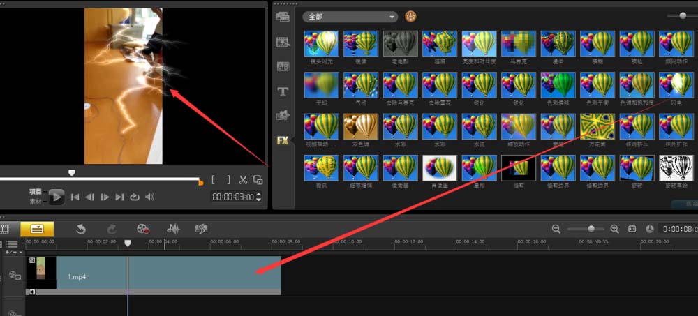 7、點擊閃電效果,拖到視頻上,就可以看見閃電效果了。