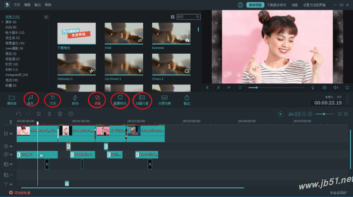除了轉場特效以外,點擊預覽窗口里的別的按鈕還可以對相冊視頻添加音樂、文字、濾鏡、動畫等等別的元素,使相冊視頻更加豐富。