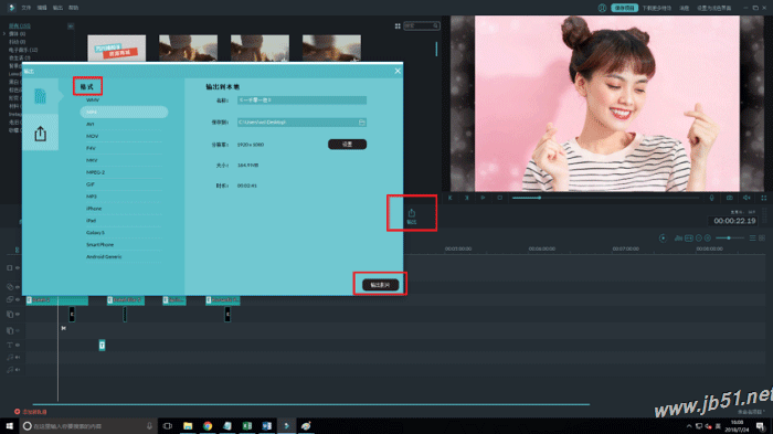 點擊預覽窗口里的輸出按鈕,選擇需要輸出的格式(一般輸出視頻為MP4),點擊輸出按鈕,屬于自己的相冊視頻就做好啦。