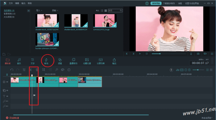 將指針拉到需要轉場的圖片,點擊預覽窗口的專場按鈕,從中單擊選擇需要添加的特效,特效就會自動添加到兩個圖片中間,這里我從中選了消去轉場效果,還有別的更多樣的選擇。
