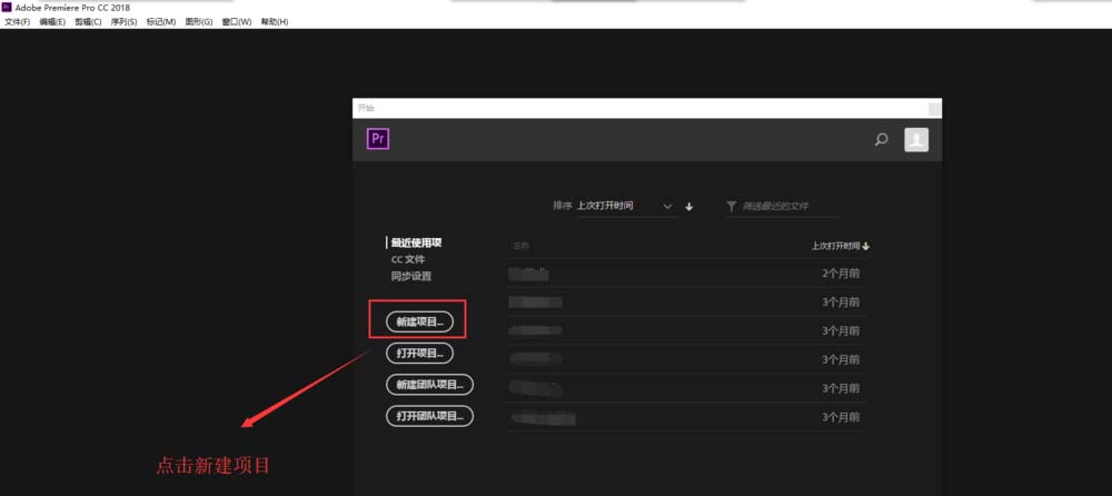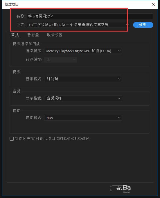 1、打開PR視頻剪輯軟件,選擇新建項目命令,在彈出的新建項目窗口中設置剪輯項目的名稱為“快節奏屏閃文字”,然后點擊瀏覽選擇一個電腦保存位置,其他設置可以保持默認,然后點擊確定進行創建即可。