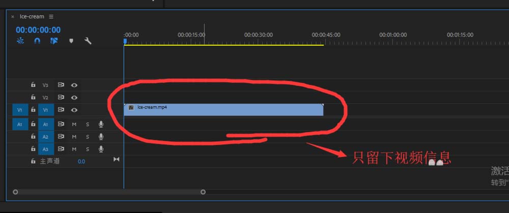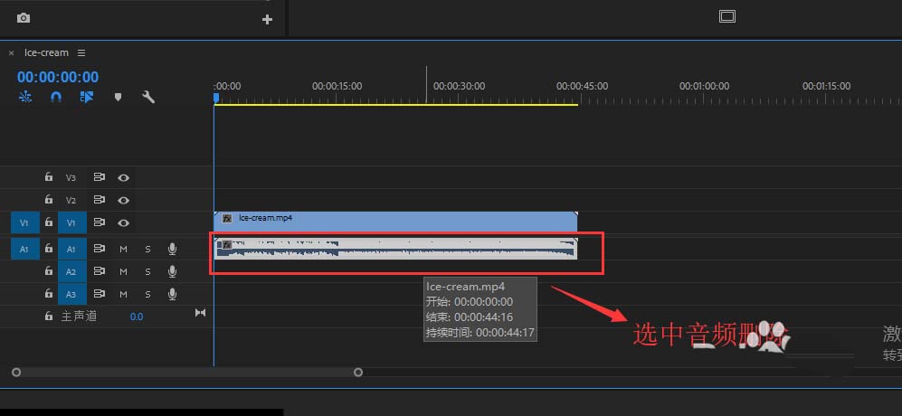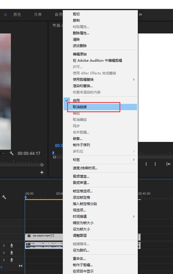 4、選中序列中的視頻媒體,右鍵鼠標,將“取消鏈接”命令勾選上,將視頻媒體的音頻與視頻進行分離,然后在單獨選中分離后的音頻,按鍵盤上的delete鍵將其刪除。只留下單獨的視頻信息。