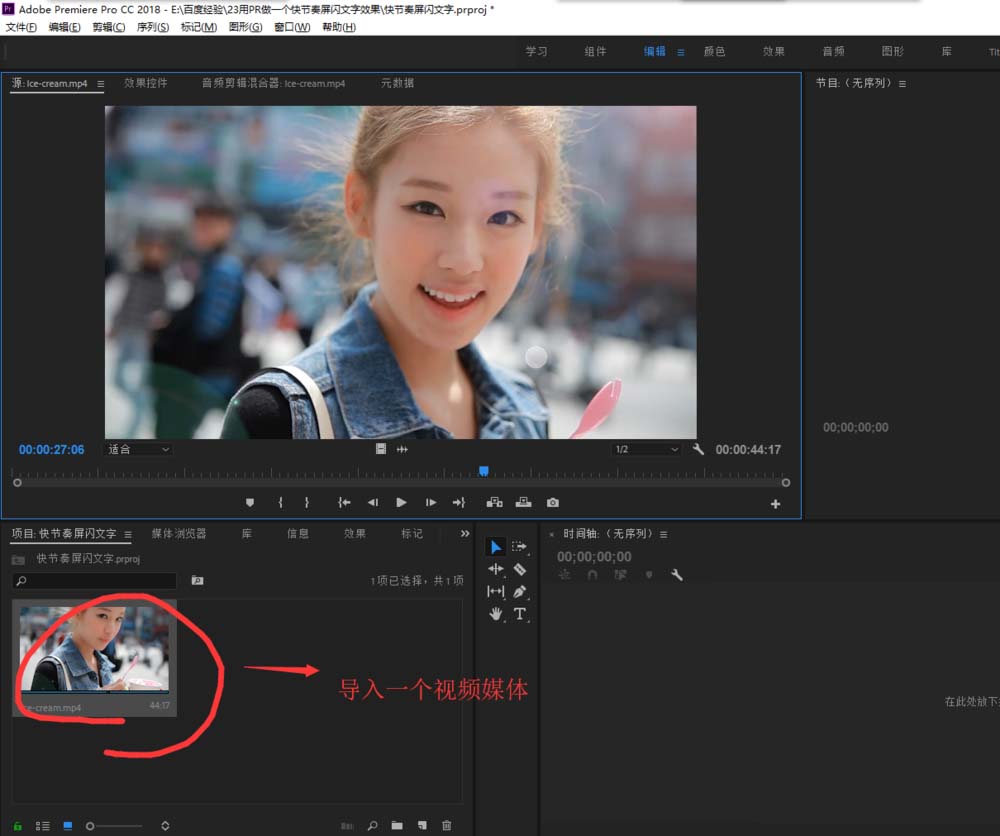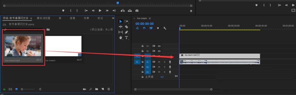 3、選中項目管理中導入的視頻媒體,按住鼠標左鍵不松,將該視頻媒體拖入到右側的時間軸窗口,在右側的時間軸窗口單擊鼠標左鍵,由這個視頻媒體來自動創建一個序列。