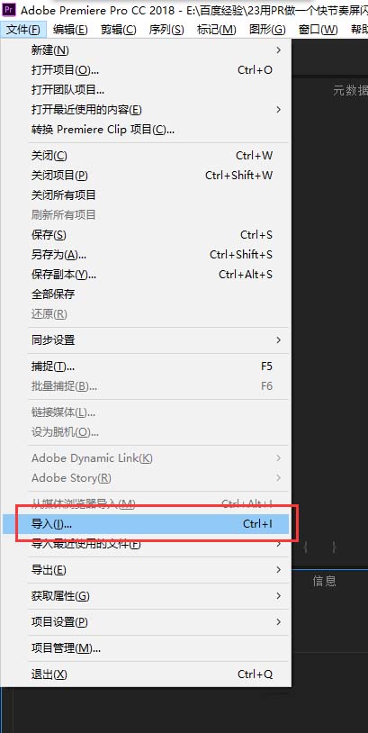 2、選擇文件菜單,在文件菜單中找到導入命令,單擊導入,在彈出的媒體導入窗口中,選擇一個視頻媒體,將該視頻媒體選中然后導入到PR中,打開PR的項目管理窗口,就可以看到我們導入的視頻媒體,雙擊該視頻媒體還可以進行預覽。