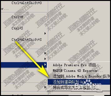 3、在彈出的下拉列表中,鼠標放在:導出,右側彈出子菜單再點;添加到渲染隊列