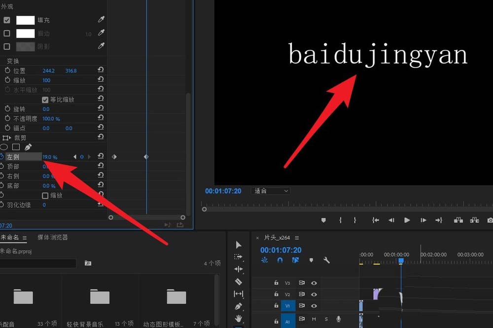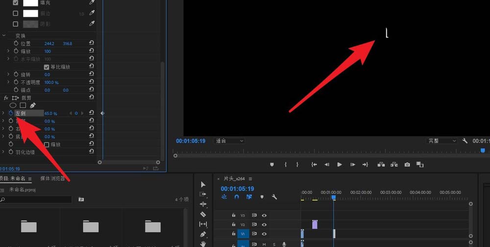 5、在效果控件中的裁剪效果下給左側打上關鍵幀,調整數值讓文字內容完全消失。
