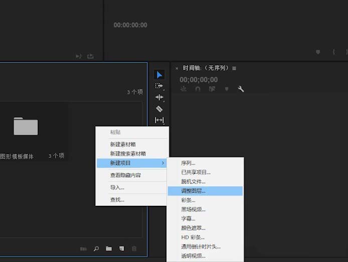 3、我們可以在項目的空白區域點擊鼠標右鍵,然后在新建項目中找到調整圖層。