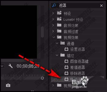 5、在右側的效果面板中搜索出軌道遮罩,并且拖給黑場視頻。