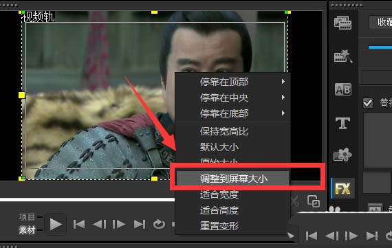 4、點擊變形素材后,將鼠標移動到視頻畫面顯示處,點擊右鍵,選擇調整到屏幕大小,如圖所示