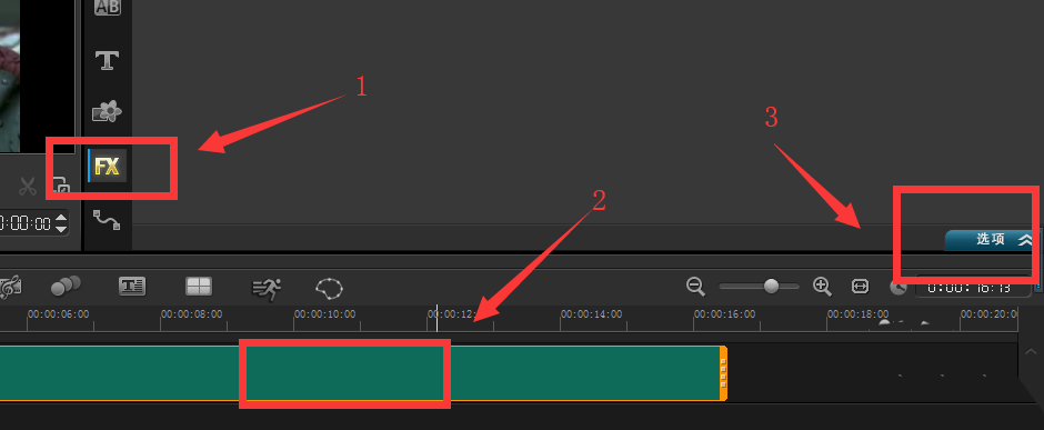 2、添加視頻后,左鍵點擊FX,然后再用左鍵點擊一下視頻,最后點擊選項,( 或者點擊FX后,直接雙擊視頻軌,的視頻 ),如圖所示