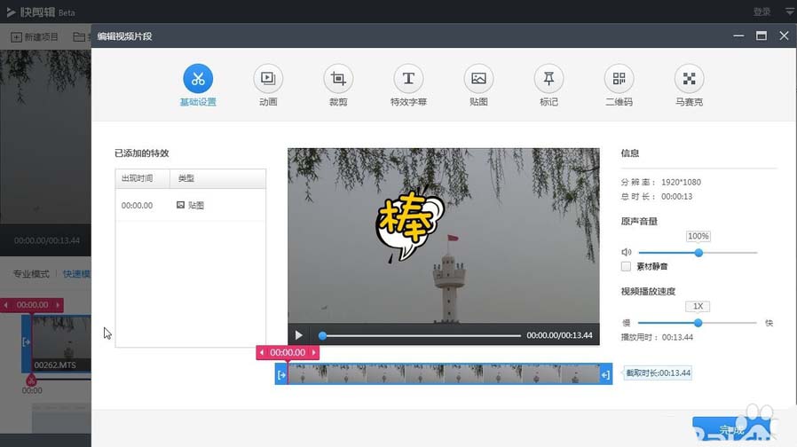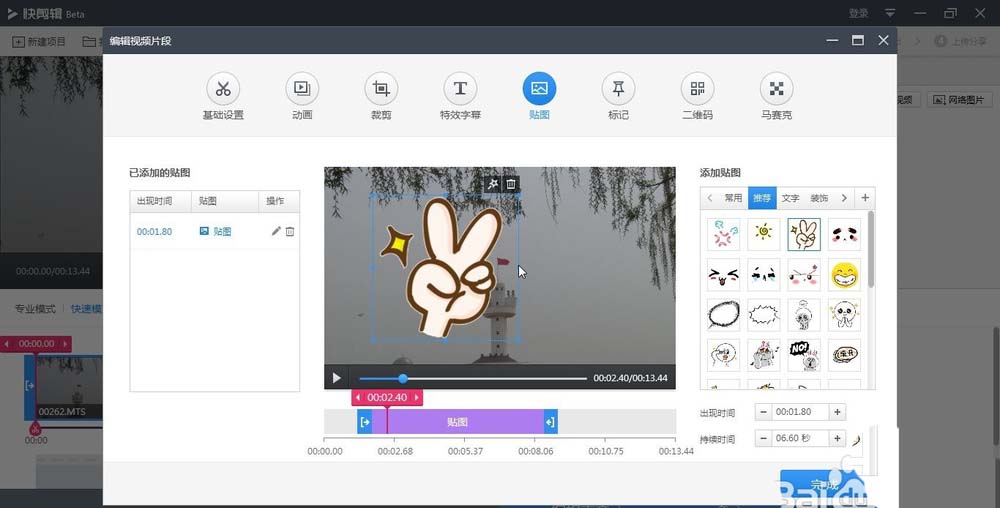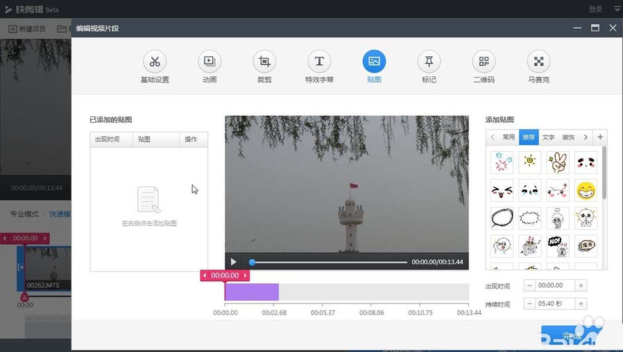 4、點(diǎn)擊之后,就在視頻上添加了默認(rèn)的貼圖了