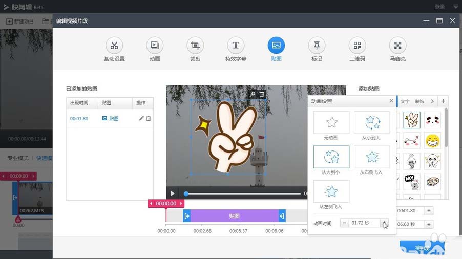 6、點(diǎn)擊視頻上面的貼圖,還可以進(jìn)行貼圖的入場動(dòng)畫設(shè)置