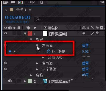 7、在效果下屬,有三項(xiàng);這三項(xiàng)都自動打上了關(guān)鍵幀。比如,點(diǎn)開左聲道。這里已打了關(guān)鍵幀